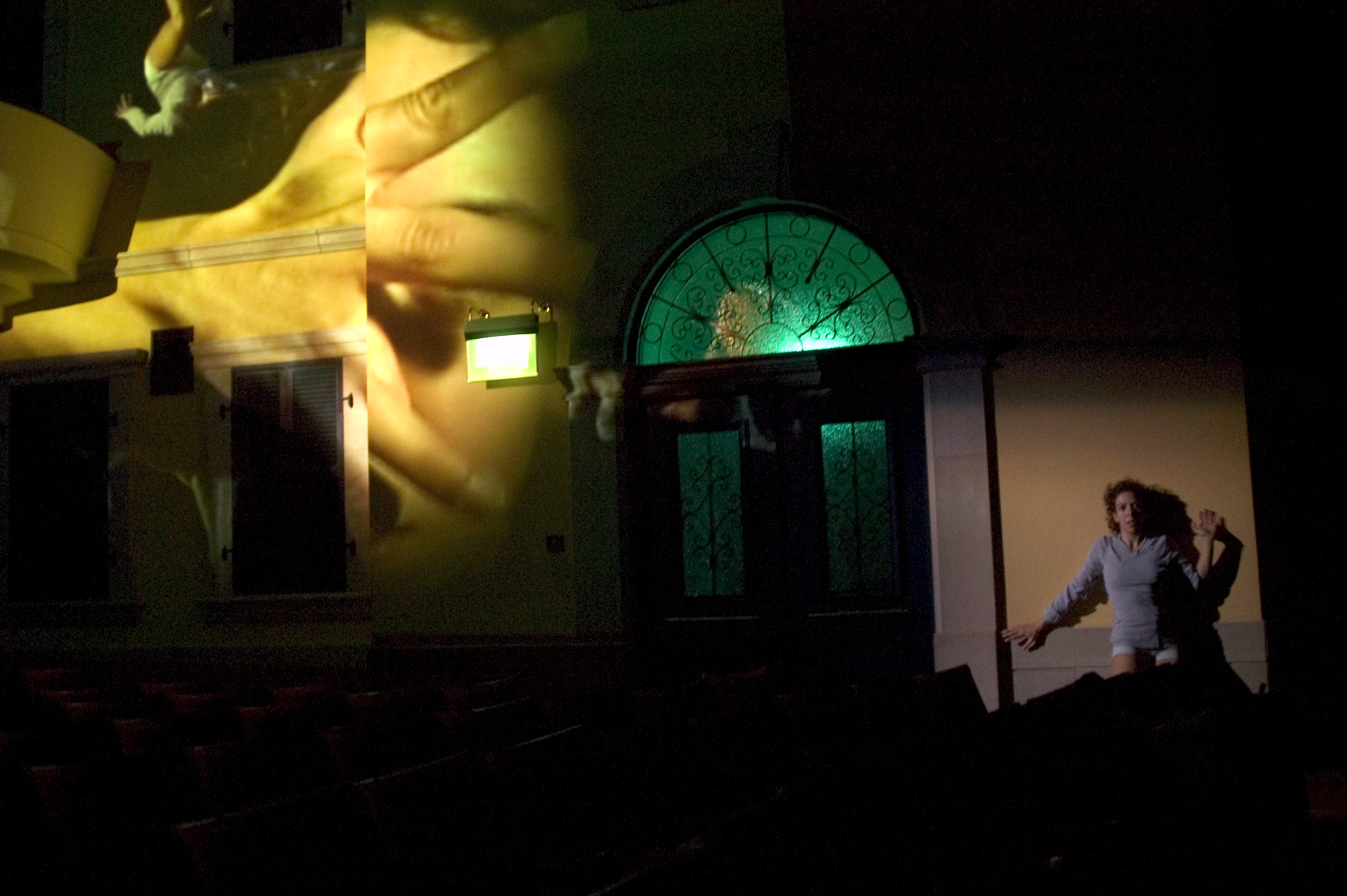 bridge (2016) is a multimedia dance performance which experiments with abandonment in various levels. It combines a solo performance with video installations creating a surround effect of sound, video and performance.