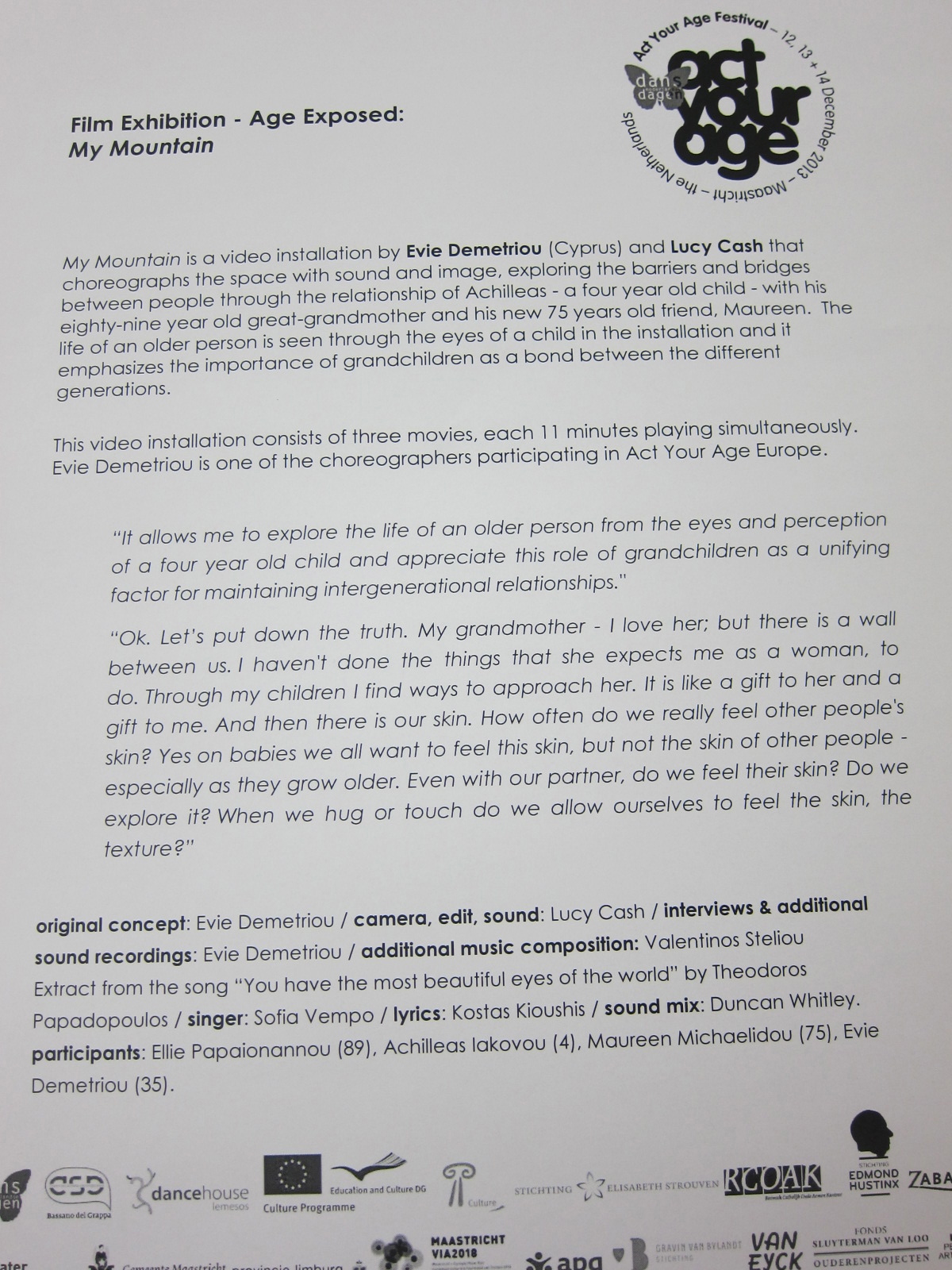 As one of the participants artists of the festival I created a project “My mountain” on intergenerational relationship addressing this issue in a rather poetic way through a video installation in collaboration with Lucy Cash. I am realizing now that this is a way we could also see life. Illnesses, disabilities, body changes or society status changes due to age can be addressed not with fear but with an “optimism” which can and is proved to be achieved through movement, dance, art.